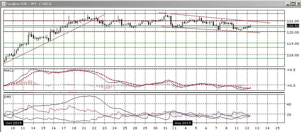 На четырёхчасовом графике пара снизилась ниже нижней границы диапазона 120,40-121,60. Боле краткосрочно можно выделить нисходящий канал с 31 октября. Так как пара восстановилась выше 120,40 и выросла от нижней границы канала, то более вероятным выглядит сейчас движение а 121,00 — ближайшему сопротивлению, которое почти совпадает с верхней границей нисходящего канала. По индикаторам направленного движения флэт: DM- и DM+ близки, гистограмма MACD около нуля, линия MACD колеблется у горизонтали.