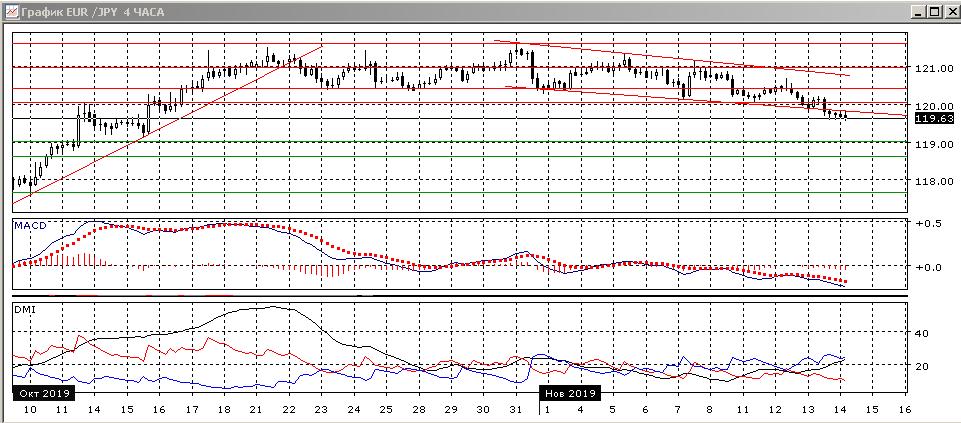 На дневном графике снижение продолжилось и пара определённо вышла из диапазона 120-121,60 вниз. Также пара преодолела сильную поддержку на 120,00 (максимум сентября). Можно рассматривать образование вершины в середине октября — середине сентября (также можно рассматривать это как две вершины с промежуточным минимумом у 120,40. Поддержки вблизи сейчас не видно, и скорее пара продолжит снижение Если предполагать снижение примерно в 300 пунктов, как волна снижения в сентябре, то целью является 118,60. По индикаторам направленного движения сохраняется коррекция к росту: превышение DM+ над DM- сохранилось, хотя оно уже небольшое, коррекция видна снижению по гистограммы MACD в отрицательной зоне, отрицательному наклону линии MACD.