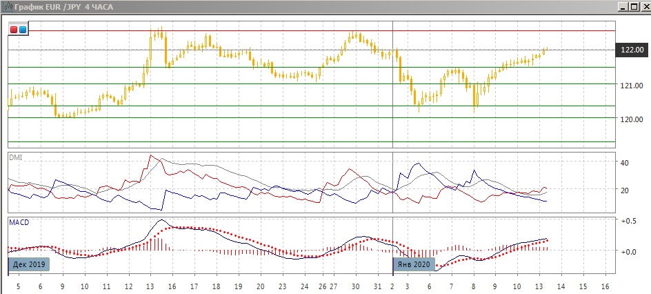 На четырёхчасовом графике пара выросла выше промежуточной вершины двойного дна у 120,35, достигнутой 7 января у 121,50. Преодоление этого уровня подтвердило модель и исходя из размера модели примерно в 120 пунктов, цель движения вверх может быть 122,70. Уровень 121,50 9-10 января выступал уже поддержкой для пары. Следующее сильное сопротивление только на 122,55, что примерно соответствует цели измеренного движения. По индикаторам направленного движения тенденцией стал рост: превышение DM+ над DM- увеличивается, гистограмма MACD остаётся в положительной зоне, линия MACD имеет положительный наклон.