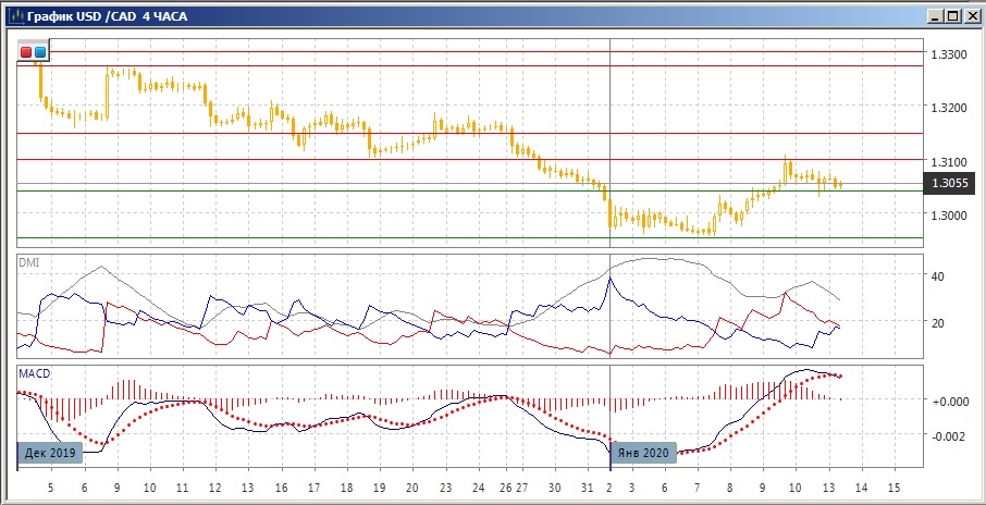 На четырёхчасовом графике ранее преодолённое сопротивление на 1,3040 тестируется уже сверху. Дальнейшая перспектива скорее будет определяться тем, останется ли пара выше этого уровня (тогда ближайшей целью становится "круглый" уровень 1,3100, или преодолеет его (тогда последовательность роста относительных максимумов и минимумов пары в этом масштабе будет нарушена). По индикаторам направленного движения дело идёт к переходу к снижению: DM- и DM+ почти равны, гистограмма MACD снижется и перешла на отрицательную территорию, линия MACD получила отрицательный наклон.