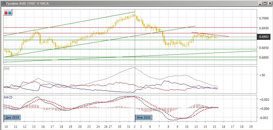 На четырёхчасовом графике пара после отскока вверх находится в клине с нижней границей на уровне поддержки 0,6885. Так как это фигура продолжения, более вероятное направление выхода - вверх, однако лучше действовать в сторону фактического выхода. По индикаторам направленного движения флэт: DM- и DM+ близки, гистограмма MACD около нулевого уровня и линия MACD приблизилась к горизонтали.