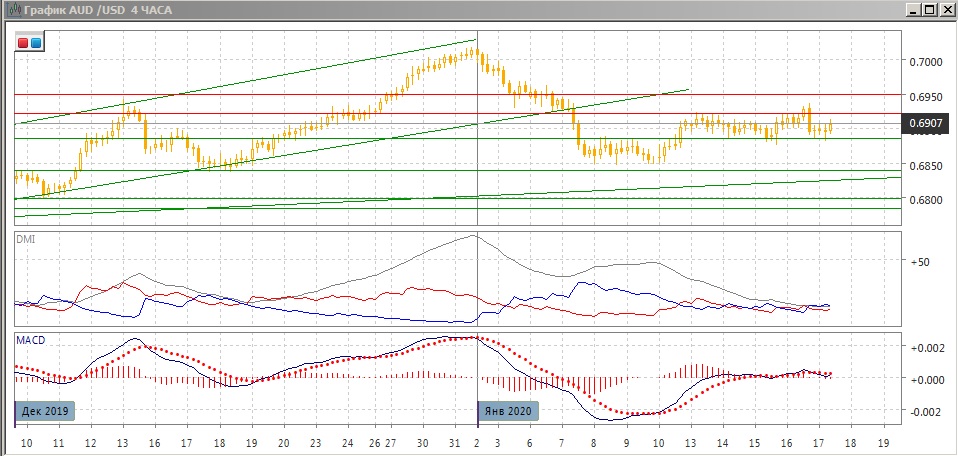На четырёхчасовом графике пара остаётся в диапазоне 0,6885-0,6920. В четверг был ложный пробой верхней границы диапазона, поэтому выход из него вниз кажется предпочтительным. В рамках движения в диапазоне предпочтителен рост к верхней границе, так как нижней пара уже достигла. Более значительное движение скорее будет в сторону выхода из диапазона. По индикаторам направленного движения флэт: DM- и DM+ близки, гистограмма MACD около нулевого уровня и линия MACD приблизилась к горизонтали.