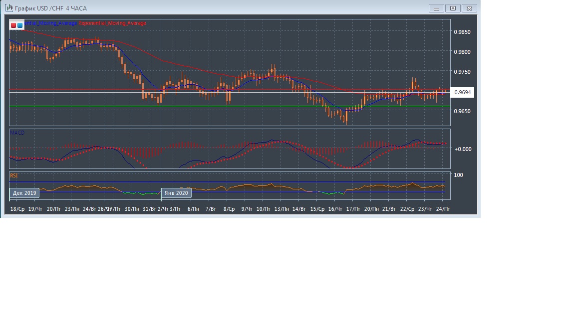 На четырёхчасовом графике скользящие средние с периодом 21 и 55 дней перестали снижаться, замедлились и развиваются вдоль горизонтальной оси. При этом график рынка вышел в область ниже экспоненциальных скользящих средних, что говорит о небольшом медвежьем потенциале рынка в краткосрочной перспективе.