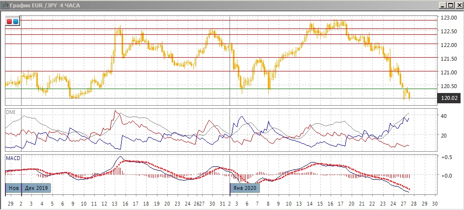 На четырёхчасовом графике произошёл небольшой отскок от сильного уровня поддержки 120,00. Однако уровень минимумов начала января пара преодолела. Снижение от 122,85 было сильным и без существенных отскоков. Дальнейшая перспектива в этом масштабе скорее определится с направлением выхода или ниже 120,00 (открывает пространство для продолжения снижения) или выше 120,30 (пара возвращается в канал и отскок становится более сильным, возможно до ближайшего сильного сопротивления на 121,00). По индикаторам направленного движения тенденция снижения сильная: превышение DM- над DM+ увеличилось при высоком и растущем ADX, гистограмма MACD остаётся в отрицательной зоне, линия MACD имеет отрицательный наклон.