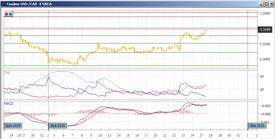 На четырёхчасовом графике, однако, видно замедление роста: образовалось медвежье расхождение максимумов пары и гистограммы MACD, это увеличивает вероятность отката. По ADX рост остаётся сильной тенденцией: превышение DM+ над DM- большое, ADX на высоком уровне. Учитывая, что пара вышла вверх из длительной узкой консолидации 9-22 января, и выход был сильным, скорее рост будет продолжаться несмотря на медвежье расхождение, для него требуется подтверждение сигнала, которого пока нет.