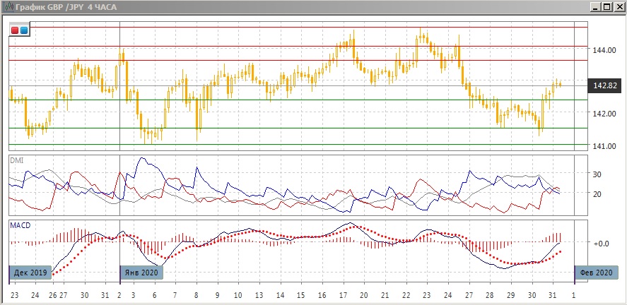 На четырёхчасовом графике, возможно, произошёл разворот после изменения фундаментальной картины (Банк Англии не снизил процентную ставку). После образования ранее бычьего расхождения минимумов пары и гистограммы MACD, пара преодолела сопротивление на 142,40 (сигнал подтвердился), и в конце 30 января уровень 142,40 вступил уже поддержкой для пары. Это делает предпочтительным продолжение роста. Однако сейчас пара достигла уровня 143, это поддержка промежуточных минимумов 20-21 января двойной вершины у 144,65. Откат от этого уровня, если он случится, может вновь найти поддержку на 142,40.