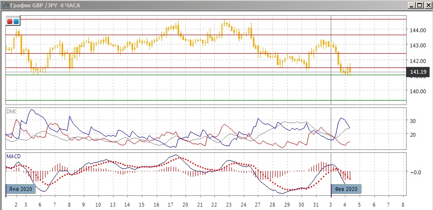 На четырёхчасовом графике, пара преодолела уровень сопротивления 141,50, и 4 февраля он уже выступает сопротивлением для пары, что делает предпочтительным продолжение снижения. Снизившись от 141,50, пара также снизилась и от минимумов 28, 30 января, близкой поддержки теперь не видно. По индикаторам направленного движения тенденцией является снижение: DM- значительно выше DM+ при относительно высоком уровне ADX, гистограмма MACD в отрицательной зоне, линия MACD имеет отрицательный наклон. Относительные минимумы пары несмотря на довольно сильный отскок 30-31 января, продолжили последовательно снижаться.