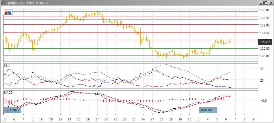 На четырёхчасовом графике видно, что после выхода вверх из диапазона 119,80-120,50 пара тестирует следующий уровень сопротивления 121,00. Хоте преодоления его не было, не было и отката, это сохраняет тенденцию роста действующей, и уровень 121,00 скорее будет преодолён. Относительные минимумы пары сейчас растут. По индикаторам направленного движения в этом масштабе тенденцией стал рост: превышение DM+ над DM- значительное при довольно высоком уровне ADX. Приостановка роста на 121,00 привела к снижению гистограммы MACD и развороту линии MACD, но о развороте это ещё не говорит. Даже при возможном дальнейшем росте, движение до 121,50 стало бы только коррекцией в 50% к снижению с середины до конца января.