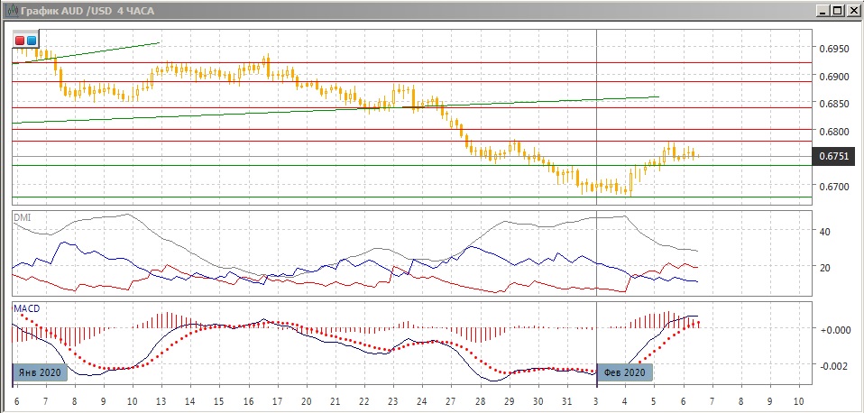 На четырёхчасовом графике последний относительный максимум был ниже предыдущего, и замедление роста в этом масштабе видно по снижению гистограммы MACD. Пара находится у ранее преодолённого сопротивления на 0,6735, и оно скорее будет сейчас поддержкой. Пока пара выше этого уровня, продолжение роста возможно, возвращение ниже него, скорее, покажет завершение коррекции вверх и возвращение пары к исходной точке роста на 0,6677. Если пара преодолеет уровень 0,6780, который ограничил рост 29 января и 5 февраля, то образовалась бы модель перевернутой головы-плечи (с уровнем шеи 0,6780), и это создало бы потенциал существенного роста, с уровнем измеренного движения близким к сопротивлению на 0,6885.