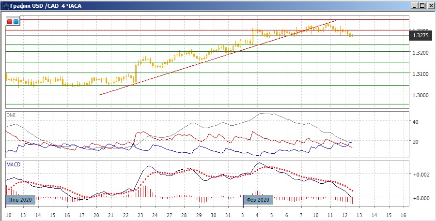 На четырёхчасовом графике произошёл разворот. Относительные максимумы и минимумы пары теперь последовательно снижаются. Пара остаётся ниже важного уровня 1,3300, и выход выше 7-10 февраля выглядит теперь должным пробоем, что делает предпочтительным снижение, так как рост не был поддержан. По более краткосрочным индикатором тенденцией становится снижение: гистограмма MACD снижается в отрицательной зоне, линия MACD имеет отрицательный наклон. Ближайшей целью отката может быть уровень 1,3230 - сопротивление 30,31 января и поддержка 3 февраля.