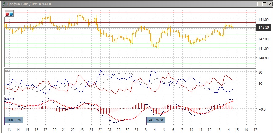 На дневном графике пара остаётся в диапазоне с начала декабря 141-144. Пара находится у сопротивления на 143,60, которое с начала декабря чаще приводило к снижению пары, чем к кратковременному движению выше, поэтому вероятность снижения от этого уровня велика, и рассчитывать на дальнейшее движение вверх до его фактического преодоления слишком рискованно. Исходя из движения в канале, более предпочтительно снижение к нижней границе на 141,00. По индикаторам направленного движения в этом масштабе флэт: DM- и DM+ близки при низком уровне ADX, гистограмма MACD около нуля.