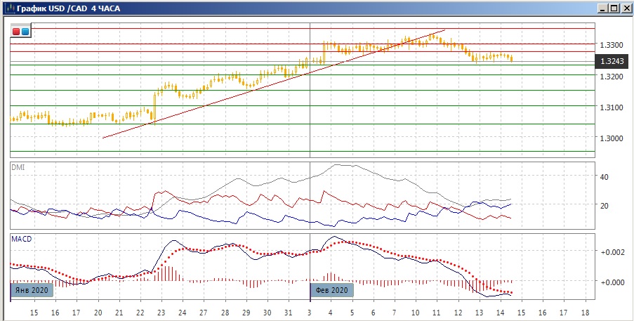 На четырёхчасовом графике пара продолжает снижаться. Относительные максимумы и минимумы пары продолжают последовательно снижаться. Отскок вверх с 12 февраля был ограничен предыдущей поддержкой на 1,3270, и от него пара снизилась почти к исходной точке отскока на 1,3230. По индикаторам направленного движения в этом масштабе снижение: DM- устойчиво выше DM+, гистограмма MACD остаётся в отрицательной зоне, линия MACD имеет отрицательный наклон.