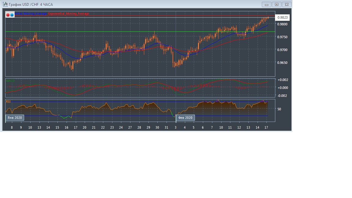 На четырёхчасовом графике скользящие средние с периодом 21 и 55 дней продолжают двигаться вверх, увеличивая расхождение. При этом график рынка развивается в области заметно выше экспоненциальных скользящих средних, что говорит о восходящем потенциале данного рынка в краткосрочной перспективе.