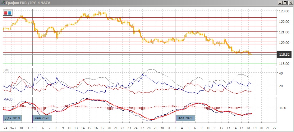 На дневном графике снижение продолжается, после закрытия 13 февраля ниже минимума ноября отскока не произошло, и скорее снижение будет продолжаться так как следующая поддержка только 118,00, а более сильная - на 117,00 (минимум конца сентября-начала октября). По индикаторам направленного движения снижение остаётся сильной тенденцией: DM- выше DM+, ADX на относительно высоком уровне, гистограмма MACD находится в отрицательной зоне, линия MACD имеет отрицательный наклон. Однако по RSI достигнута граница перепроданности (30) , что увеличивает вероятность отскока.