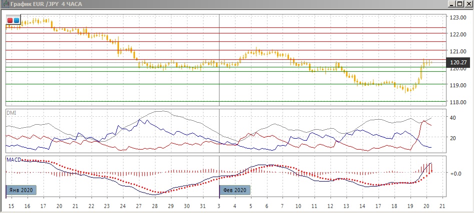 На четырёхчасовом графике происходит консолидация после сильного роста в границах 120-120,45. Резкий отскок приостановился в среду на 120,45 - этот уровень был верхней границей диапазона в конце января - начале февраля. Выход из этого флага, скорее, будет вверх, так как это фигура продолжения - но необходимо фактическое преодоления сильного уровня сопротивления. По индикаторам направленного движения рост стал сильной тенденцией: превышение DM+ над DM- очень большое при высоком уровне ADX, гистограмма MACD растёт в положительной зоне, линия MACD имеет положительный наклон.