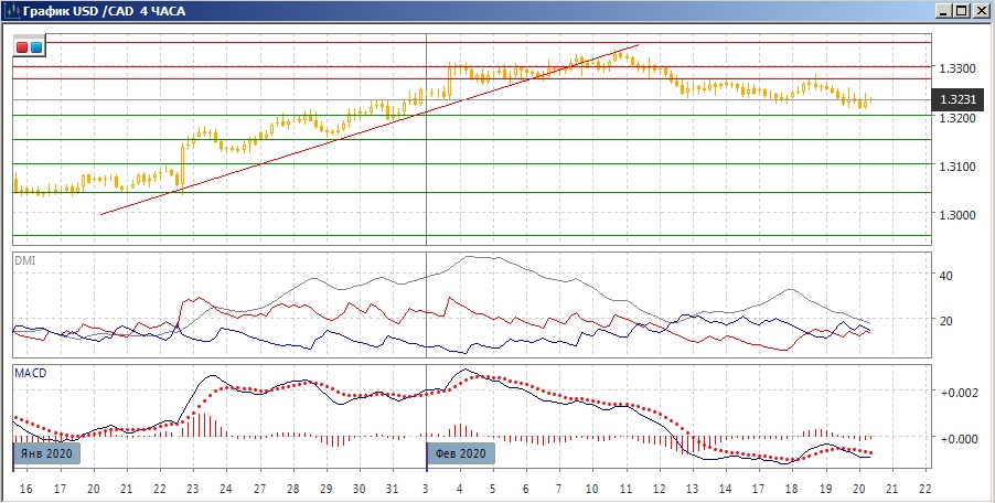 На четырёхчасовом графике пара вышла из консолидации 1,3230-1,3270 вниз, уровень 1,3230 уже вступает сопротивлением. Это делает предпочтительным продолжение снижения, исходя из размера диапазона до 1,3190, и оставляет в силе картину разворота враз после преодоления линии восходящего тренда. По индикаторам направленного движения тенденция слабая - превышение DM- над DM+ невелико, гистограмма MACD остаётся в пределах около нуля.