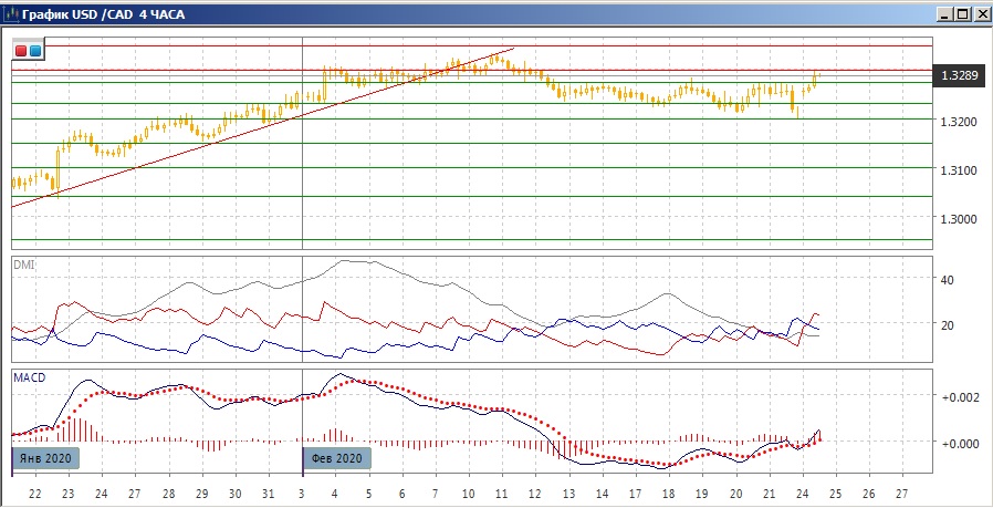 На дневном графике после относительно широкодиапазонной свечи снижения с выходом из консолидации 1,3230-1,3270 произошёл гэп вверх. Если пара закрепится выше 1,3270, это изменило бы картину разворота. По индикаторам направленного движения сохраняется коррекция к росту: DM+ остаётся выше DM-, ADX на очень высоком уровне, коррекция видна по нахождению гистограммы MACD в отрицательной зоне, отрицательному наклону линии MACD.