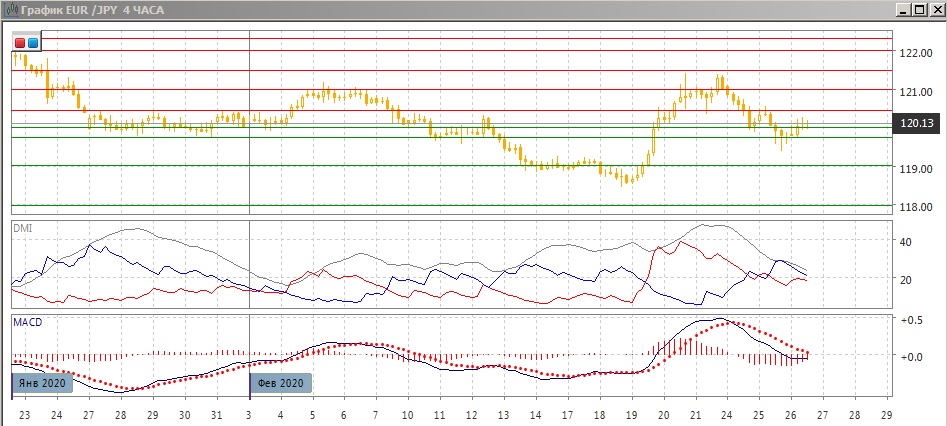 На дневном графике пара вернулась к зоне поддержки 119,80-120,00. Возможно, пара стабилизируется - уровень ADX стал низким. Зона поддержки не преодолела, и пара может остаться в диапазоне. Ближайшей перспективы роста, скорее, нет, как пара не закрепилась выше 121,00 (у предыдущего максимума февраля), и снижение произошло несмотря на образование близкой к молоту свечи 21 февраля. Преодоление зоны поддержки 119,80-120,00 сделало бы снижение предпочтительным.