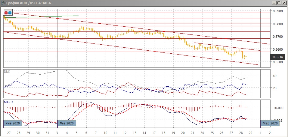 На четырёхчасовом графике не видно признаков разворота, хотя в этом масштабе также наблюдается перепроданность - RSI ниже 30, бычье расхождение минимумов пара и гистограммы MACD уже тройное. Пара остаётся ниже более краткосрочной линии тренда, построенного по максимумам с 21 февраля. Сейчас он близок к ближайшему "круглому" уровню сопротивления, что усиливает это сопротивление. По ADX тенденция снижения сильная - превышение DM+ над DM- большое и устойчивое, ADX на высоком уровне. Скорее, пара дойдёт до 0,6500, но отскок назревает.