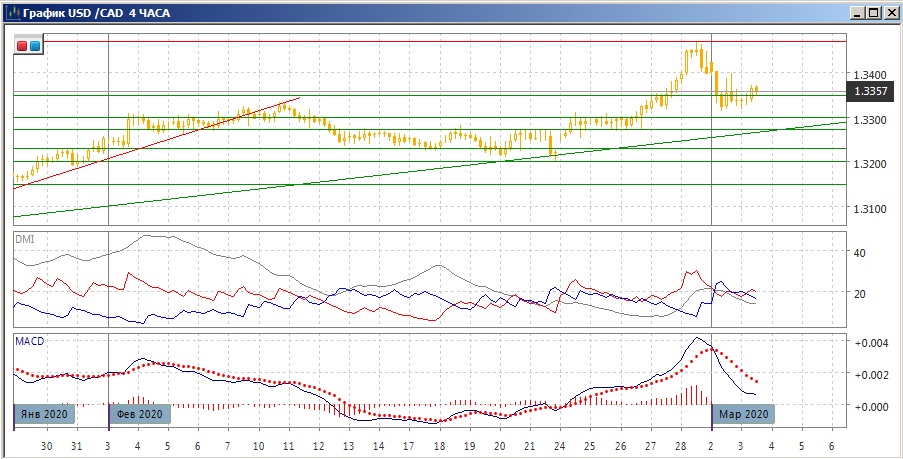 На четырёхчасовом графике откат от 1,3470 стабилизировался около уровня поддержки 1,3350. Дальнейшая перспектива скорее будет определяться от того, преодолеет ли пара уровень 1,3350, или от этого уровня будет разворот вверх. Пока, скорее, стоит дождаться где пара закрепится выше 1,3350 или ниже. Если рассматривать снижение от 1,3470 как коррекцию к росту от 1,3200, то возобновление роста кажется предпочтительным, но верхние тени свечей 2 марта и небольшой рост в начале 3 марта скорее не в пользу возобновления роста в данный момент.