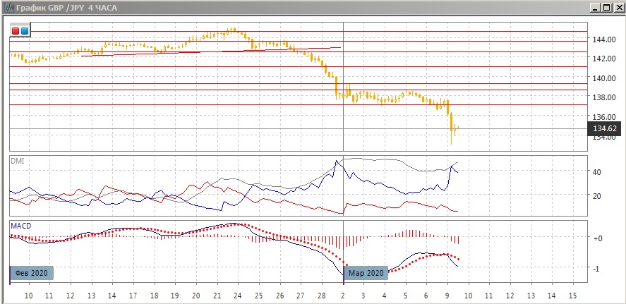 На дневном графике пара достигла нового минимума ниже максимума сентября у 135. Пока отскок не является существенным, но важно закрытие дня, которое может быть, при текущей волатильности, совершенно другим. Без образования явного "молота" продолжение снижения является предпочтительным. Целью может быть зона коло 130. Кроме того, что это следующее сильной сопротивление ниже 135,00, это примерно соответствует цели измеренного движения, если предполагать равенство волн снижения от 145 до 137 и от 138,60. По индикаторам направленного движения тенденция остаётся сильной: превышение DM- над DM+ очень большое, ADX остаётся на высоком уровне, гистограмма MACD снижается в отрицательной зоне, линия MACD имеет отрицательный наклон.