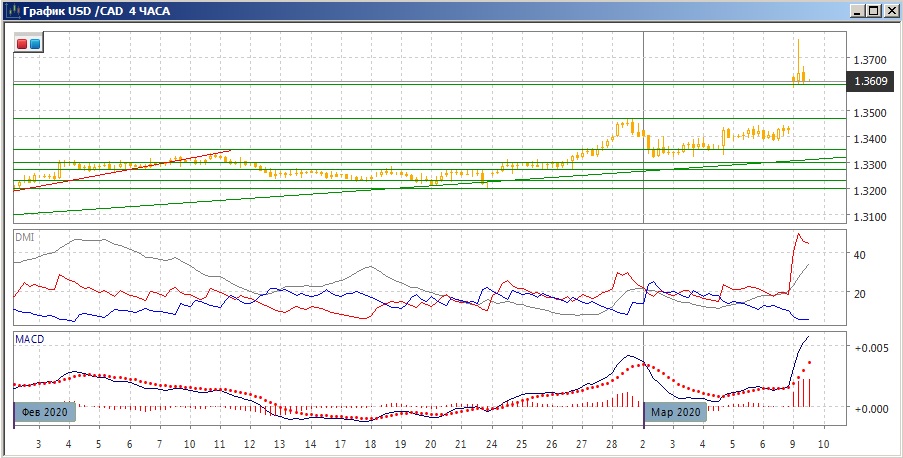 На четырёхчасовом графике возможна стабилизация - рост выше 1,3600 продавался, но сам этот уровень является "круглым", и там завершается разрыв, что укрепляет его как поддержку. По ADX рост очень сильный: DM+ сильно выше DM-, уровень ADX высокий и растёт. Гистограмма MACD растёт в положительной зоне, линия MACD имеет положительный наклон. В этом масштабе, как и в более крупном, назрела коррекция, но разворота самой тенденции роста не видно.