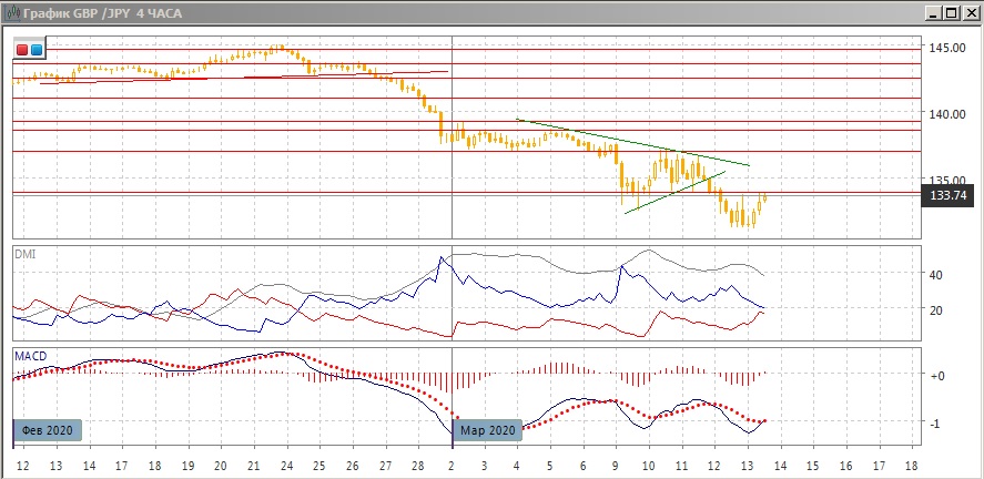 На четырёхчасовом графике пара вернулась к уровню 134, нижней границы консолидации 9-11 марта. При продолжении снижения от этого уровня стоит ожидать возобновления снижения. Если он будет преодолён, это показало бы по крайней мере краткосрочный разворот. По индикаторам направленного движения пара приближается к развороту: DM- и DM+ сблизились, гистограмма MACD выросла о нулевого уровня, линия MACD разворачивается.