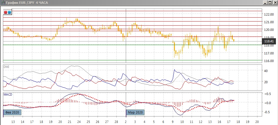На дневном графике пара в пятницу резко выросла. Хотя развития роста не было, пара, возможно, стабилизировалась - отскок от 116 произошёл во второй раз. Разрыв в начале прошлой неделе вновь закрыт, и это может предполагать продолжение роста, если пара останется выше разрыва (и уровня 119). Однако если будет снижение ниже минимумов февраля у 118,40, это было бы медвежьим знаком. По индикаторам направленного движения коррекция к снижению: - DM- остаётся выше DM+, но гистограмма MACD растёт, линия MACD перешла к горизонтали.