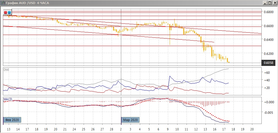 На четырёхчасовом графике сохраняется сильная тенденция снижения. Возобновление снижения после коррекции верх до 0,63 и относительно легкое преодоление следующего "круглого" уровня 0,6200 говорят о том, что существенной поддержки для пары сейчас нет и скорее снижение будет продолжаться. По ADX тенденция и в этом масштабе очень сильная - превышение DM- над DM+ остаётся очень большим, ADX на высоком уровне и рост продолжается. Замедление снижения видно по росту гистограммы MACD. Образовалось бычье расхождение минимумов пары и гистограммы MACD, но подтверждения этого сигнала нет.