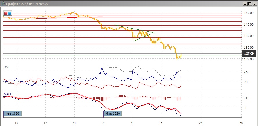 На дневном графике пара преодолела минимумы 2019 г. у 126,50. Поддержка сейчас находится на 125,00. Тенденция снижения остаётся сильной. Последовательность снижения относительных максимумов и минимумов пары сохраняется. Широкодиапазонная свеча снижения в среду предполагает, что движение может продолжиться в краткосрочной перспективе. По индикаторам направленного движения тенденция снижения остаётся сильной: DM- значительно выше DM+, ADX на высоком уровне и растёт, гистограмма MACD находится в отрицательной зоне, линия MACD имеет отрицательный наклон. Признаком замедления или разворота пока нет. По RSI пара вышла из зоне перепроданности. Однако, вероятность отскока вверх увеличивает просто размер волны снижения - от 145 это уже 2000 пунктов. Если пара восстановится выше 126,50 и останется выше этого уровня, пробой сможет рассматриваться как ложный и в таком случае появился бы сигнал с отскоку.