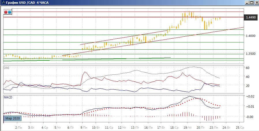 На четырёхчасовом графике снижение 19-20 марта можно считать коррекционным. Оно не поменяло тенденцию, и сейчас пара восстановила большую часть потерь . Завершение коррекции предполагает возвращение к уровню 1,4650, однако рост выше него маловероятен: кроме уже учтённого в ценах негатива для канадского доллара, на этом уровне образовалось бы медвежье расхождение максимумов пары и гистограммы MACD, что укрепляет сопротивление на 1,4650.