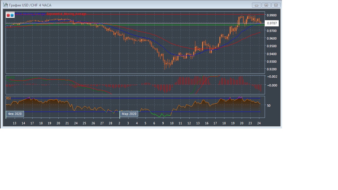 На четырёхчасовом графике скользящие средние с периодом 21 и 55 дней продолжают двигаться вверх, увеличивая расхождение. При этом график рынка развивается в области выше экспоненциальных скользящих средних, что говорит о бычьем потенциале данного рынка в краткосрочной перспективе.