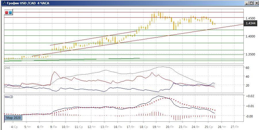 На дневном графике тестирование уровня 1,4500 не привело к его преодолению. Откат может привести пару к линии восходящего тренда по минимумам с 9 марта. Это будет уровень около 1,42. Последовательность роста относительных минимумов пары ещё не нарушена. По индикаторам направленного движения - коррекция к росту: по ADX рост остаётся сильной тенденцией, превышение DM+ над DM- большое, ADX на высоком уровне. Снижение гистограммы MACD показывает замедление тенденции. Пара выходит из зоны перепроданности по RSI. Пока снижение не выходит за пределы коррекционного, и рассчитывать на его продолжения очень рискованно.