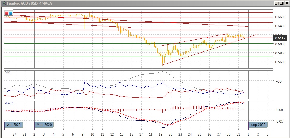 На дневном графике отскок вверх продолжается. Он остаётся в пределах сужающегося канала с 19 марта. Пара находится около его нижней границы, и выход вниз может обозначить возобновления снижения, так как пока текущий рост кажется коррекционным к снижению с декабря. По индикаторам направленного движения сохраняется коррекция к снижению: превышение DM- над DM+ остаётся большим, ADX на очень высоком уровне, линия MACD получила положительный наклон, гистограмма MACD растёт уже в положительной зоне. Психологически важный уровень 0,60 может быть сейчас сильной поддержкой, так как в целом волатильность уменьшается..