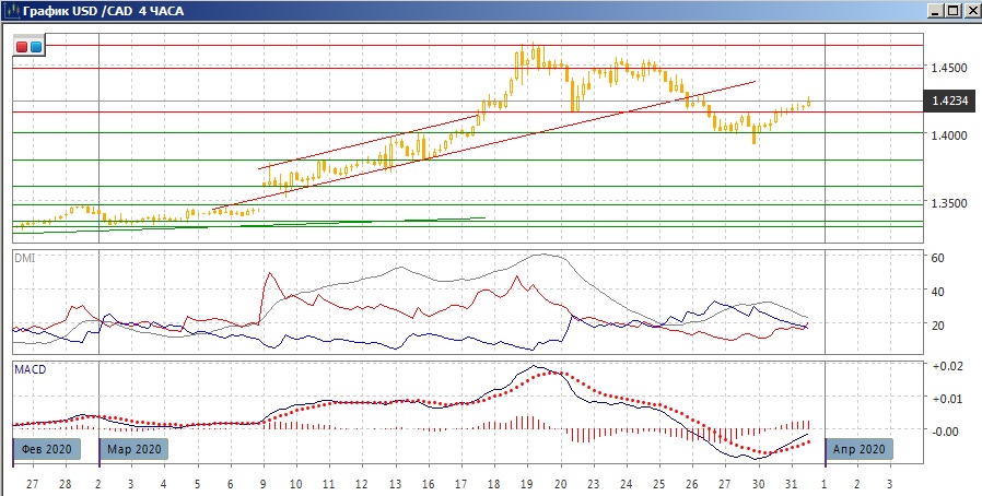 На дневном графике пара восстановилась от уровня 1,40, и находится выше уровня относительного минимума 20 марта 1,4155. Это может привести пару обратно к 1,4500. Однако текущий отскок можно рассматривать и как коррекцию к волне снижения. По индикаторам направленного движения - коррекция к росту: превышение DM+ над DM- сохраняется, коррекция видна по снижению гистограммы MACD уже в отрицательной зоне, развороту линии MACD.