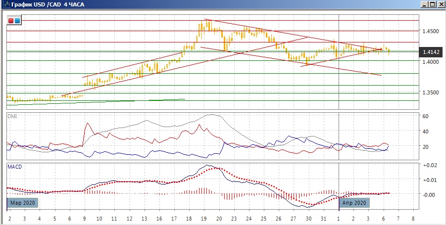 На четырёхчасовом графике пара осталась около середины треугольник, образованного нисходящей линией тренда с 19 марта, и более краткосрочной восходящей линией с 27 марта. Если посмотреть по-другому, пара остаётся около середины диапазона 1,4000-1,4300. По индикаторам направленного движения в этом масштабе флэт: ADX на низком уровне, гистограмма MACD около нуля, линия MACD почти горизонтальна. Тут также происходит сужение полосы Боллинджера, что повышает вероятность относительно сильного движения в направлении выхода из диапазона. Пока скорее лучше подождать и увидеть, в каком направлении будет выход.