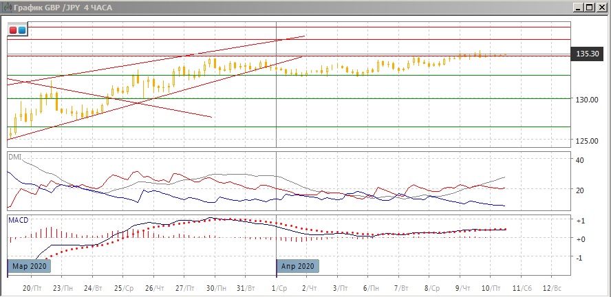 На четырёхчасовом графике последовательный рост с начала апреля сохраняется, но пара не преодолела верхнюю границу диапазона 132,75-135,00. На верхней границе образуется ряд свечей "дожи", и стоит подождать, закрепится ли пара выше или ниже уровня 135,00. Скорее дальнейшее более существенного движение будет в этом направлении. По ADX рост является сильной тенденцией: превышение DM+ над DM- большое. Пока более вероятным видится продолжение роста, так как отката от верхней границы канала не было, и более похоже, что уровень преодолевается.