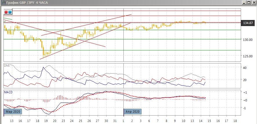 На четырёхчасовом графике сильно затянулась остановка почти на одном уровне - около 135,00. Это уменьшает вероятность выхода вверх, так как при "нормальном" преодолении уровня продолжение роста уже должно было бы случиться. Сейчас стоит подождать и посмотреть, в какую же сторону от 135,00 произойдёт выход фактически.