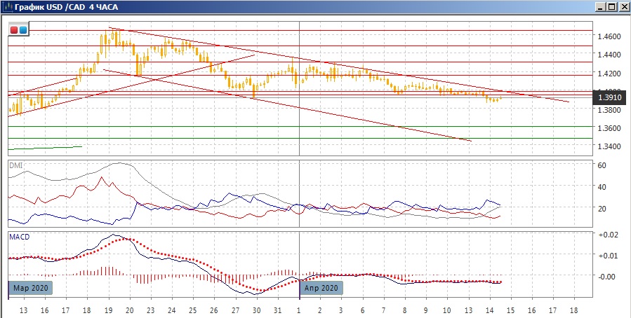 На четырёхчасовом графике снижение замедлилось, но оно продолжается. Пара преодолела поддержку на 1,3945 (около минимумов 27 марта, 7 , 9-13 апреля). Теперь уровень 1,3945 может быть ближайшим сопротивлением при отскоке вверх. Укрепляет сопротивление нахождение рядом нисходящей линии тренда с 19 марта. По ADX в этом масштабе снижение стало более выраженным: превышение DM- над DM+ увеличилось, уровень ADX вырос. В целом, снижение сейчас остаётся предпочтительным, даже если и будут отскоки вверх.