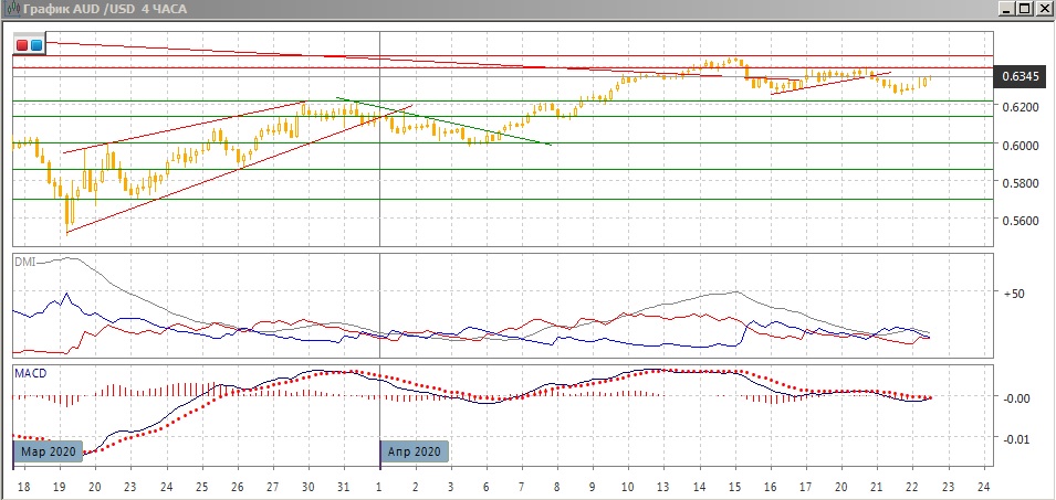 На четырёхчасовом графике образовался новый относительный минимум выше 0,6220. Если рассматривать движение в канале 0,6220-0,6400, то рост к верхней границе кажется более предпочтительным. Движения сейчас медленные, образуются свечи с небольшим "телом", это, возможно, говорит о том, что пока импульса для выхода из текущего диапазона нет. По индикаторам направленного движения также флэт: DM+ и DM- близки, гистограмма MACD около нуля, наклон линии MACD небольшой.