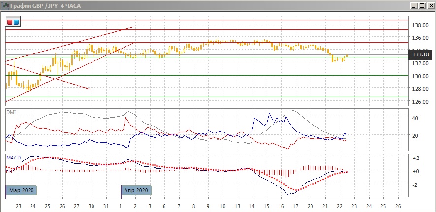 На четырёхчасовом графике пара получила 21-22 апреля поддержку на 132,00. Это ниже уровня поддержки/сопротивления в конце марта - начале апреля на 132,75. И это делает предпочтительным снижение, пока пара ниже 132,75. Сейчас пара выше этого уровня, и важно, закрепится ли она выше, или останется ниже диапазона. Более вероятным видится снижение, но если пара закрепится выше 132,75, выход ниже 21-22 апреля стал бы "ложным пробоем" и сделал предпочтительным возвращение к верхней границе на 135,00. По индикаторам направленного движения тенденцией стало снижение: DM- выше DM-, гистограмма MACD имеет снижается и достигла нулевого уровня, линия MACD разворачивается.