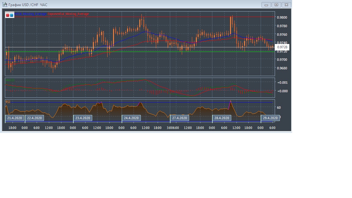 На часовом графике скользящие средние с периодом 21 и 55 дней замедлились, развернулись вниз и теперь увеличивают расхождение. При этом график рынка развивается в области ниже экспоненциальных скользящих средних, что говорит о медвежьем потенциале данного рынка в краткосрочной перспективе.