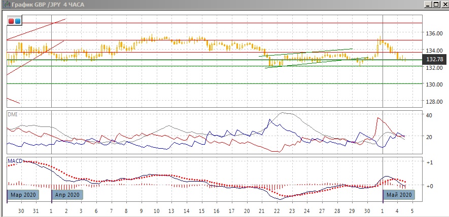 На дневном графике пара остаётся в канале с конца марта, границы его можно расширить до 132,00-135,00. ара достигла верхней границы в четверг и приблизилась к нижней. У 135,00 уже образовалось три вершины. Это сильный сигнал и подтверждением было бы снижение ниже уровня 132,00. Картину можно трактовать и как более широкая модель голова-плечи с линей шеи около 132. В этом случае подтверждением фигуры также было бы преодоление поддержки на 132,00.
