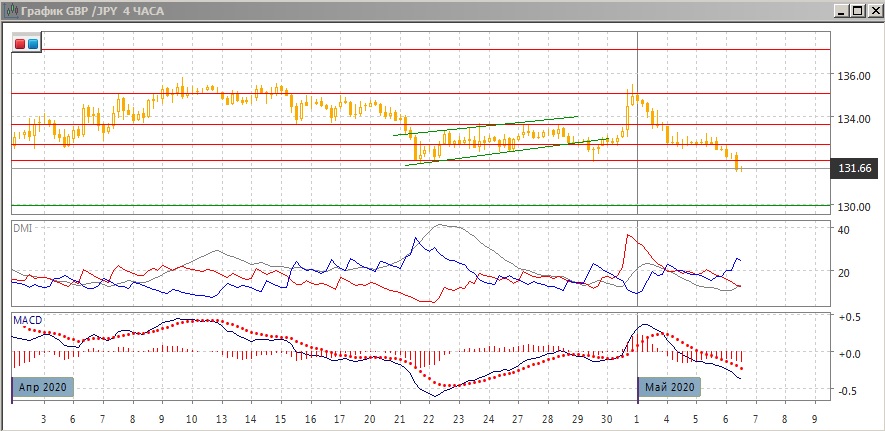 На дневном графике пара достигла минимумов апреля у 132. Закрытие в среду может быть ниже канала с конца марта 132,00-135,00. Это может обозначить завершение консолидации и переход к снижению, если пара закрепится ниже 132. Исходя из размера диапазоне в 300 пунктов, целью измеренного движения может быть уровень 129. По индикаторам направленного движения флэт, однако, сохраняется: DM+ и DM- близки, ADX на низком уровне, гистограмма MACD около нуля, линия MACD примерно горизонтальна. Снижение ниже 132 также стало бы подтверждением модели "голова-плечи", образующейся с конца марта. С такое случае снижение также является более долгосрочным медвежьим сигналом.