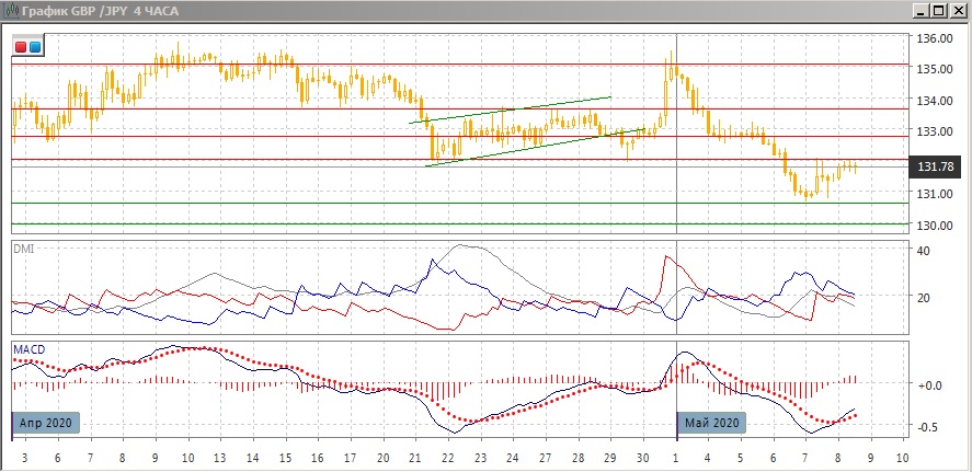 На дневном графике пара преодолела уровень минимумов апреля у 132. Сейчас она остаётся ниже этого уровня уже третий день. Так как быстрого возвращения назад не было, больше вероятность, что прорыв не ложный. Исходя из размера диапазона 132,00-135,00 в 300 пунктов, целью измеренного движения является уровень 129,00. Это также примерно соответствует цели модели "голова-плечи", при снижении ниже 132,00 был преодолён уровень "шеи". По индикаторам направленного движения тенденцией становится снижение, но тенденция слабая. DM- сейчас заметно выше DM+, однако ADX, гистограмма MACD недалеко от нуля, линия MACD начинает получать отрицательный наклон.