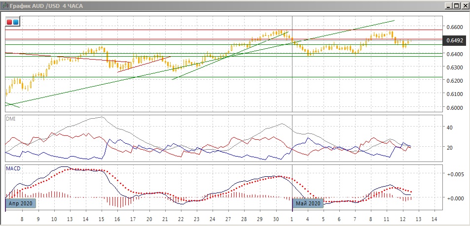 На дневном графике образовалась вершина у сопротивления на 0,6570, там же, где была вершина конца апреля. Потенциально это создаёт возможность образования двойной вершины, так как сопротивление 0,6570 может быть сильным из-за того, что это уровень уже проявил своё действие и пара снизилась примерно после приближения снизу к линии восходящего тренда с середины марта. Для подтверждения двойной вершины необходимо снижение ниже поддержки на 0,6375. Фактором, затрудняющим сейчас рост, является образование тройного медвежьего расхождения максимумов пары и гистограммы MACD - это редкий, но сильный сигнал возможного разворота. Однако пока разворот фактически не произошёл, и рассчитывать на него рискованно. Рост относительных максимумов и минимумов пары продолжается.
