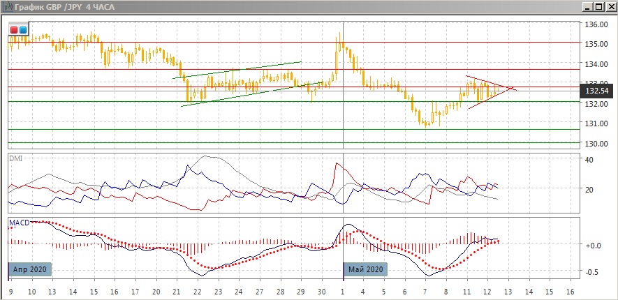 На дневном графике отскок вверх приостановился у уровня сопротивления 132,75. С одной стороны то, что пара вернулась в диапазон 132,00-135,00, делает возможным, что снижение ниже в начале мая было ложным прорывом. Если пара закрепится выше 132,00, то в рамках движения в диапазоне более вероятно движение к верхней границе на 135,00. Для того, чтобы ситуации ложного прорыва не было, нужно возвращение пары ниже 132,00. Другим фактором. осложняющим снижение, явился рост уже после преодоления линии шеи модели "голова-плечи" на 132,00. В этом случае, если пара удержится выше 132,00, сигналом стало уже движение в направлении, противоположном модели. По индикаторам направленного флэт: DM- и DM+ пересекаются, ADX на низком уровне, снижение гистограммы MACD компенсируется положительным наклоном линии MACD.