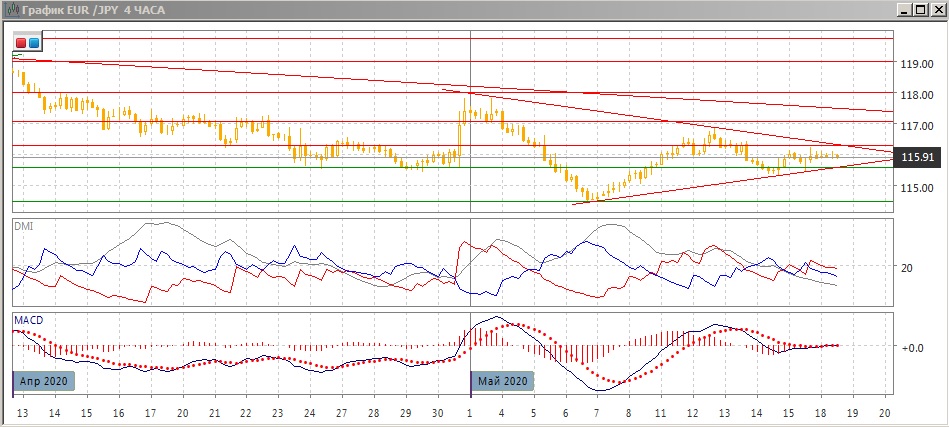 На четырёхчасовом графике движение примерно приостановилось в середине между уровнями поддержки и сопротивления 115,60-116,30. В этом масштабе можно представить треугольник с сначала мая. Сейчас пара подходит к выходу из него, что совместилось бы с преодолением важной поддержки или сопротивления. По индикаторам направленного движения флэт: DM- и DM+ пересекаются, ADX на низком уровне, гистограмма MACD уменьшает размах колебаний около нуля, линия MACD примерно горизонтальна. Скорее сейчас стоит действовать в направлении выхода за границы 115,60-116,30, когда это произойдёт.