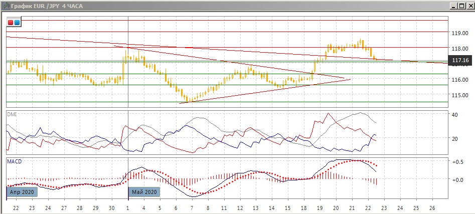 На четырёхчасовом графике пара развернулась: был преодолён относительный минимум 20 мая, уровень 118,00 выступил уже сопротивлением и прорыв уровня 118,00 можно рассматривать как ложный. По индикаторам направленного движения тенденцией стало снижение: DM- теперь ниже DM+, гистограмма MACD снижается в отрицательной зоне, линия MACD имеет отрицательный наклон. Пара достигла ближайшей к 118,00 поддержки у 117,00, и здесь снижение может остановиться, тем более этот уровень примерно соответствует долгосрочной линии тренда с января. Дальнейшая краткосрочная перспектива, вероятно, будет зависеть от того, устоит ли уровень 117,00 - если да, то более вероятно возобновление роста, если уровень будет преодолён, то она может вернуться к зоне поддержки 115,60-116,30.