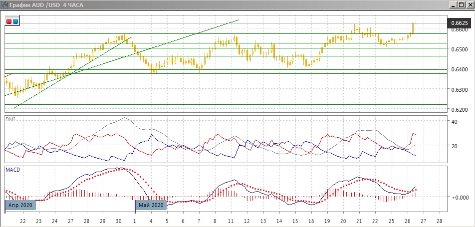 На четырёхчасовом графике видно относительно энергичный прорыв уровня 0,6570. При это пара выросла уже выше "круглого" уровня 0,6600 - сопротивления для максимумов 20-21 мая. Скорее резкий прорыв вверх показывает, что рост будет продолжаться. Это тем более вероятно, что произошёл этот прорыв вверх после возвращения пары в канал, и следовательно прорыв показывает сильную поддержку для пары. Пока она остаётся выше 0,6570, продолжение роста видится более вероятным в ближайшей перспективе.